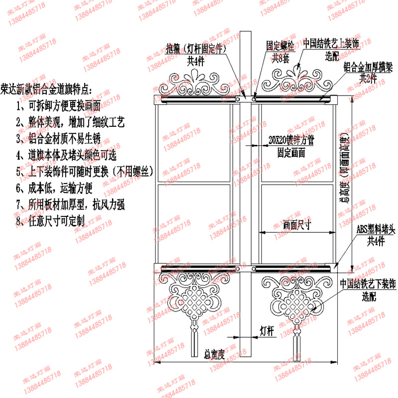 型號:RZ-DQ1228 材質:鋁型材+鍍鋅鋼板 顏色:銀色(可根據需要訂做) 表面處理:靜電噴塑+烤漆 內部骨架:20*20鍍鋅方管 抱環:鍍鋅鋼板50*5數控成型 視窗:噴繪布 照明:不可裝 特點:外觀精美 輕便 永不生銹(不用整個道旗拿下來換畫面) 換畫:用膠水粘畫面 畫面材質:噴繪布或其它布類 參考尺寸(mm):1350*1200 1350*1800 1500*2000 1500*2200 裝飾件名稱:鐵藝中國結 材質:鍍鋅鋼板激光切割 尺寸(上部):210X550 尺寸(下部):650X550 品牌:rozekj/榮澤 裝飾件顏色:紅色或自訂 以下是燈桿燈箱道旗廣告牌實際效果圖片: